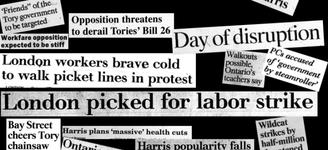 Wrapped up in legislative and legal processes and the architecture of industrial relations, the Common Sense Revolution was a profoundly coercive and violent transformation. Popular forces responded in kind, with hundreds of thousands of people answering Stompin’ Tom’s question “Will you break the law somehow?” with a resounding “YES!”